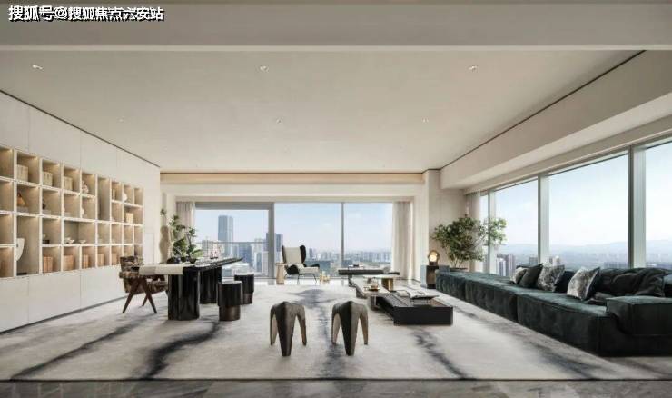 项目总建筑面积约52万方,涵盖高端住宅、大型商业、商务办公等多元业态,其中大平层产品以现代极简主义风格建筑外立面,大面积玻璃幕墙搭配金属线条,在阳光下熠熠生辉,成为区域内的标志性建筑。