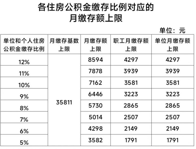 2025住房公积金年度住房公积金月缴存基数上限为35811元,具体缴存比例对应月缴存额上限如下图。