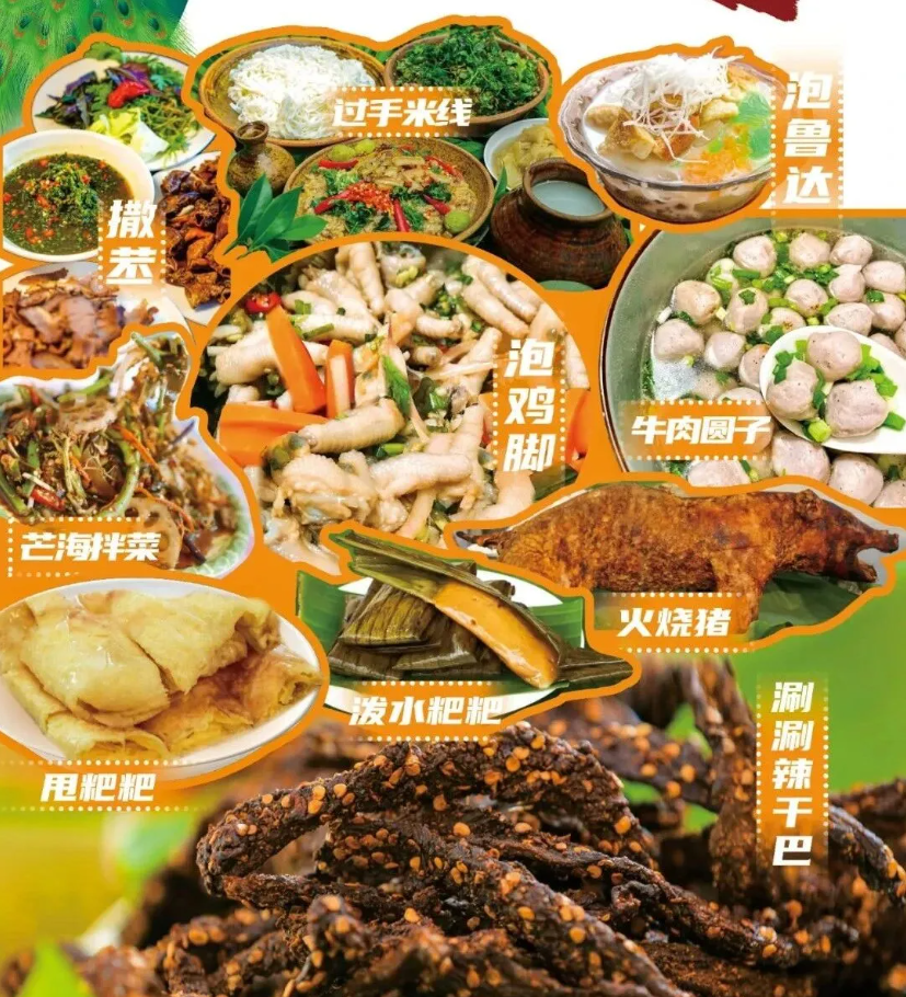 最先是从味蕾开始蔓延。德宏的味道从不是单一的刺激,而是多民族生活智慧的交融。不单一的“酸”是来自山野的百果之酸,有酸角熬成的酱、柠檬捣出的汁、羊奶果和胭脂果泡的酒,清新开胃,瞬间激活味蕾;富有层次的“辣”没有霸道的灼烧,而是穿插了小米辣、涮涮辣、山苍子、山胡椒根的香气,让人欲罢不能。小吃涵盖的内容也很丰富,早点是解锁德宏的第一把钥匙,想要读懂德宏,至少先读懂满满两张长桌的佐料台;撒苤充满了德宏人的生活哲学,微苦、回甘,韵味悠长;绿叶宴、过手米线体现着德宏人的生活态度,包容、共享,最原生态、最直接的分享快乐;咖啡里饱含德宏人的拳拳爱国之心,从种子到杯子的新鲜醇香,保存并记录着900余份咖啡种质资源的密码。当然,必须来点跨界的惊喜,503.8公里的国境线让缅甸甩粑粑的焦香与本地腌菜膏的酸爽碰撞,25条航线带来的“数字游民”把北方的面食揉进傣味香料,每一种新奇风味,都是温暖的包容与共生。